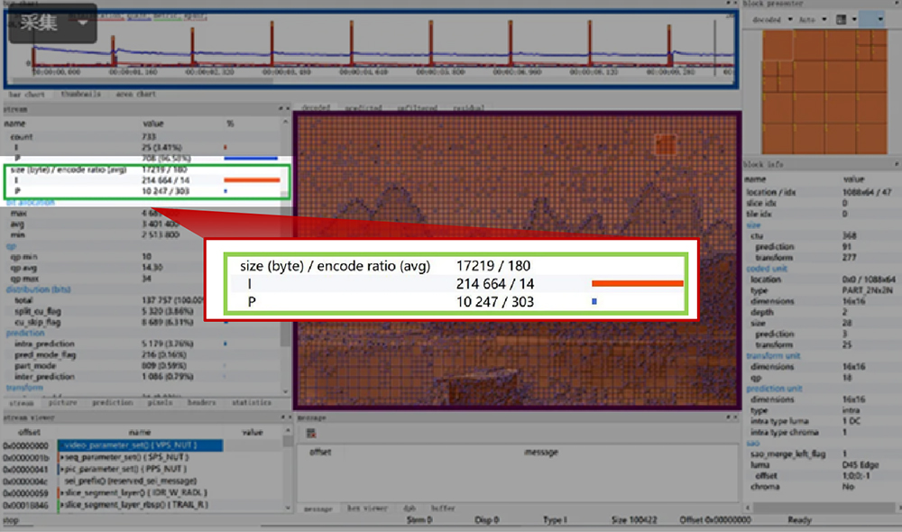 2、H.265采用幀間預測編碼,采用關鍵幀(I幀,決定畫質)和差異幀(P幀,只傳輸有差異部分)方式,偏靜態時,關鍵幀占總碼率95% (如下圖)。則其關鍵幀大小為:20M*95% /2 = 19Mb/ 2幀=9.5M。